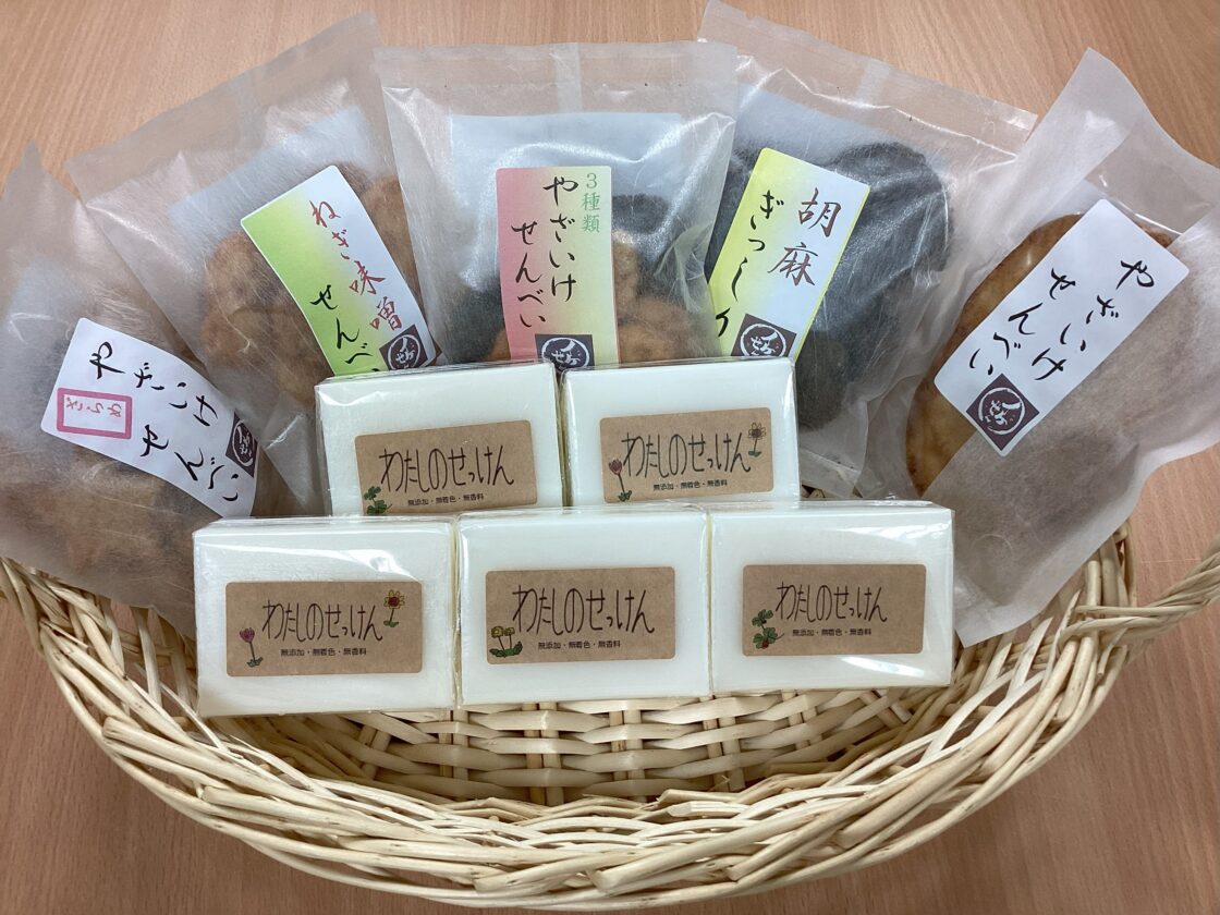 館内に入ると目を引くのはその清潔さ。どこもさっぱりときれいに保たれています。これは就労継続支援A型が毎日しっかりと清掃をしてくれるから。就労継続支援B型で販売している「谷在家せんべい」や生活介護で販売している「わたしのせっけん」も大人気商品。日々、お仕事を頑張るご利用者の賜物です。