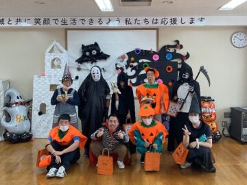 ご利用者実行委員会を行い、今年は何のイベントを行うか計画します。ある年は、みんなが参加でき楽しめるのはハロウィンとなり、ご利用者・職員が仮装して、スタンプラリー形式で「トリック・オア・トリート!」を合言葉に各部屋を訪れ、お菓子をあげる人も、もらう人も大満足でした。みんなで話し合い、企画して楽しいイベントを一緒に作り上げています。